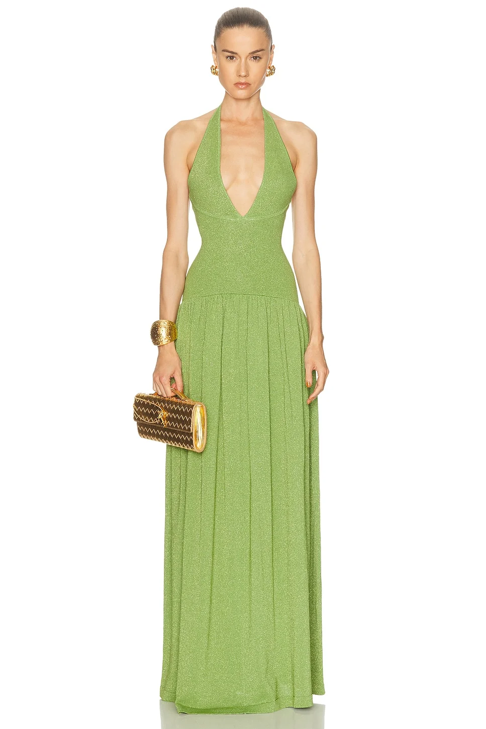 Details - 60% rayon, 32% nylon, 5% metallic fibers, 3% spandex - Hand wash - Unlined - Pull-on styling - Halterneck design - Plunging V-neck design - Heavyweight metallic jersey fabric - Made in China - Our Style No. RTFF-WD750 - Manufacturer Style No. R-SS26-12692-17