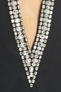 Details - Self: 85% polyester, 15% viscose - Lining: 97% polyester, 3% spandex - Made in China - Dry clean - Fully lined - Pull on styling - Embellished v-neck - Faux embellished welt pockets - Satin textile - Our Style No. RTFF-WD704 - Manufacturer Style No. FW24-10010