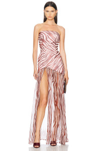 Details - Self: 100% silk - Lining: 97% polyester, 3% spandex - Made in China - Dry clean only - Partially lined - Hidden side zipper closure - Chiffon fabric with high front slit - Our Style No. RTFF-WD605 - Manufacturer Style No. FW22-5555
