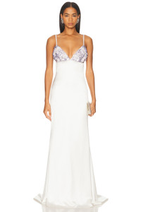 Details - Self 1: 97% viscose, 3% spandex - Self 2: 100% polyester - Lining: 95% polyester, 5% lycra - Dry clean only - Fully lined - Hidden back zipper closure - Back hook and eye clasp closure - Sequin embellished fabric bust and shoulder straps - Deep scoop neckline at back - Satin fabric - Made in India - Our Style No. RTFF-WD667 - Manufacturer Style No. R-SS25-11392-17
