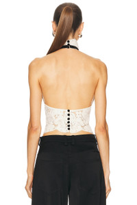 Details - Self: 58.3% cotton, 21.5% viscose, 20.2% polyamide - Lining: 100% polyester - Made in China - Hand wash only - Back and collar button closure - Velvet ribbon on collar - Lightweight lace fabric - Cropped styling - Our Style No. RTFF-WS182 - Manufacturer Style No. R-FW25-11866-11
