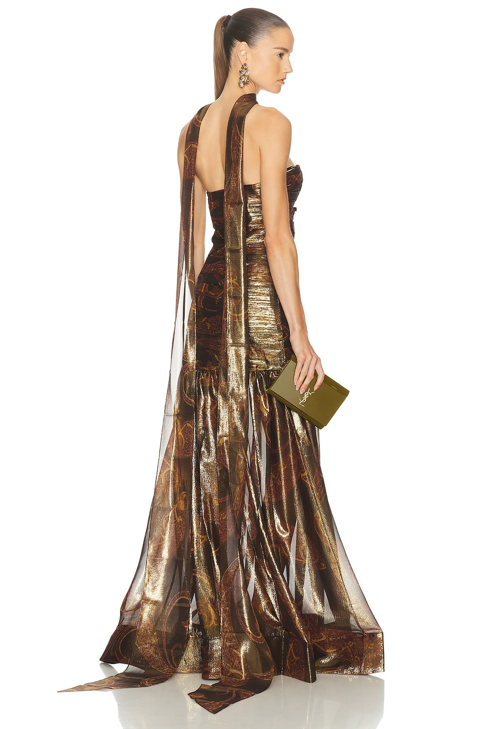 Details - Self: 78% silk, 22% metallic - Lining: 100% polyester - Made in China - Hand wash - Fully lined - Hidden side zipper closure - Satin textile - Detached neck scarf - Boned bodice - Pleated body - Set hem at skirt - Our Style No. RTFF-WD703 - Manufacturer Style No. R-FW25-11883-17