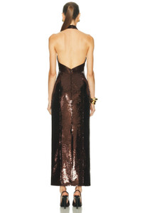 Details - Self & Lining: 100% polyester - Contrast Fabric: 73% acetate, 27% polyester - Dry clean only - Fully lined - Hidden back zip closure - Halterneck styling with button loop closure - Back vent - Heavyweight sequin fabric - Made in China - Our Style No. RTFF-WD692 - Manufacturer Style No. R-PF25-11626-17