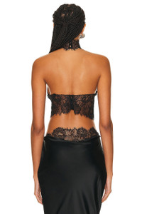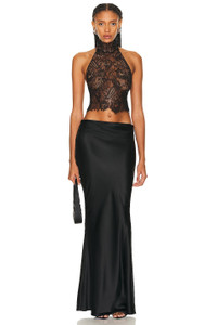 Details - Self 1: 95% silk, 5% spandex - Self 2: 100% nylon - Made in China - Dry clean only - Halterneck styling with button loop closure - Back button loop closure - Sheer lace fabric - Item not sold as a set - Our Style No. RTFF-WS120 - Manufacturer Style No. HL24-8386