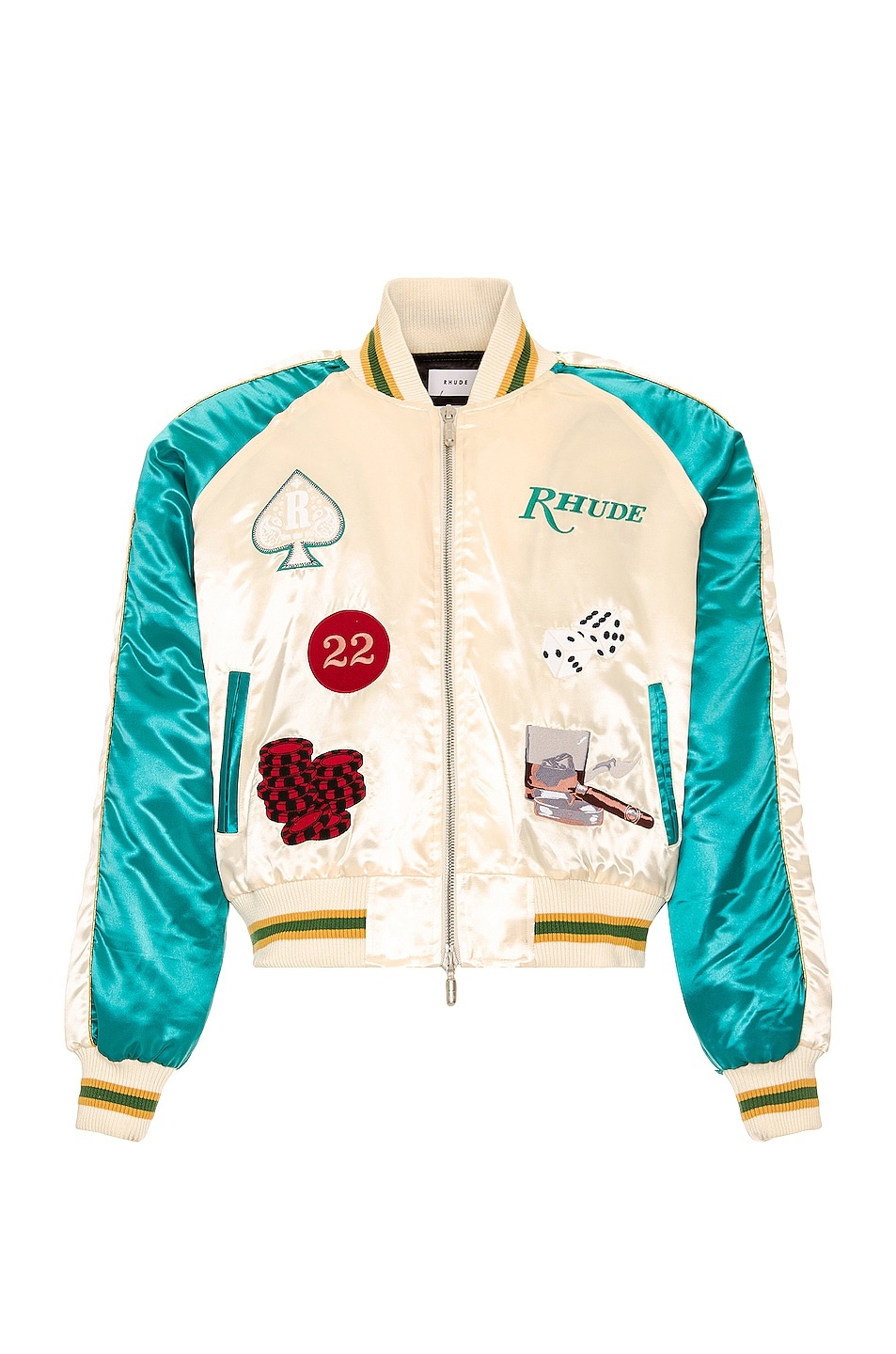 Details - Self: 100% poly - Contrast Fabric: 96% poly, 4% lycra - Lining: 100% poly - Made in USA - Dry clean only - Two-way zip front closure - Side slip pockets - Rhude logo embroidered at chest - Casino-inspired patches throughout - Our Style No. RHUF-MO26 - Manufacturer Style No. RHSS22JA13188377