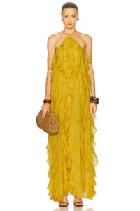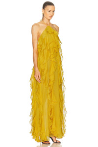 Details - 100% polyester - Dry clean only - Fully lined - Halterneck tie-up closure - Open back - Sheer chiffon fabric with ruffle detail throughout - Made in China - Our Style No. RONR-WD775 - Manufacturer Style No. 4284370CHI