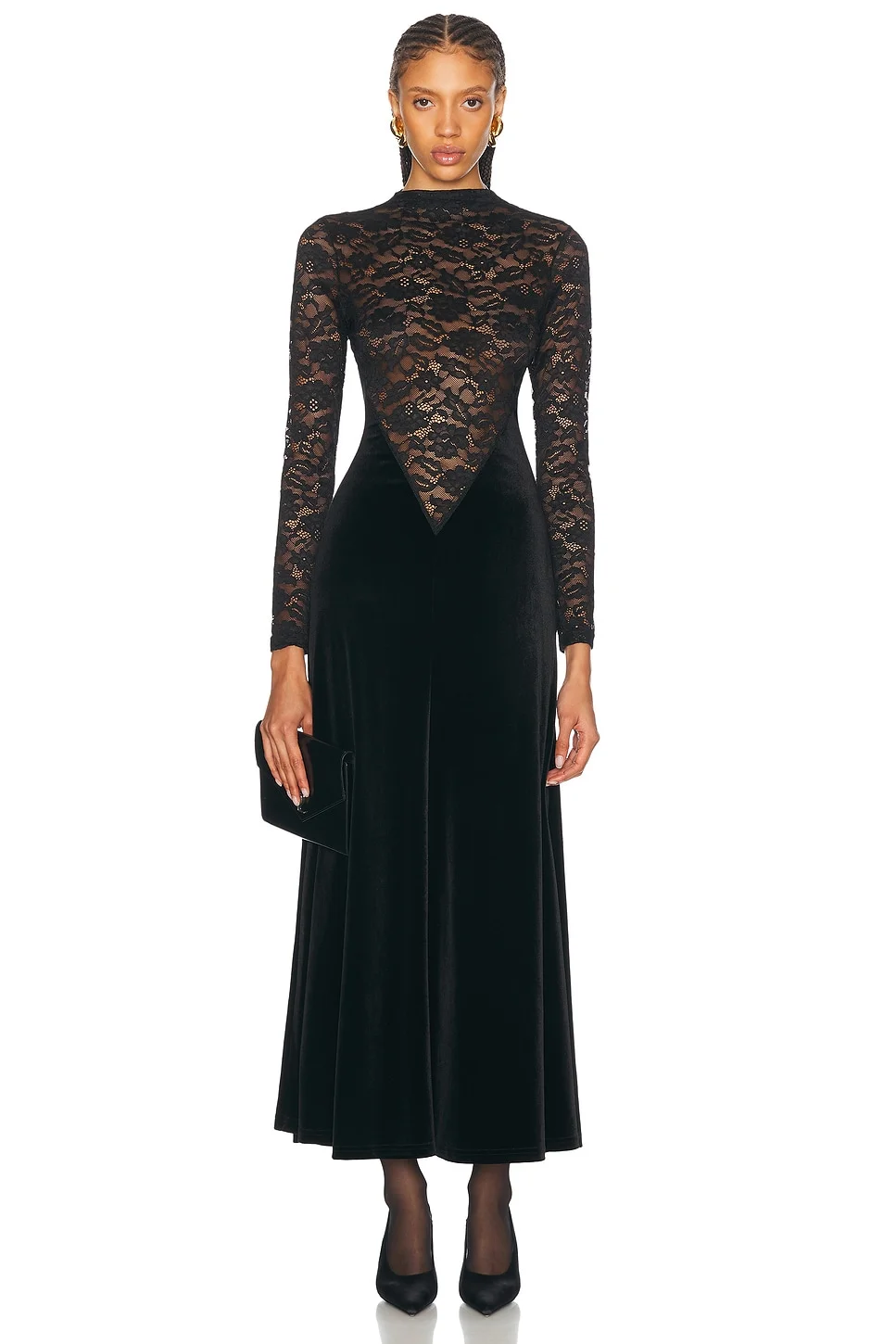 Details - Self: 90% nylon, 10% spandex - Self 2: 94% polyester, 6% spandex - Made in China - Dry clean only - Unlined - Hidden back zipper closure - Lace fabric at top - Velvet fabric at skirt - Garment is made with a semi-sheer fabric, undergarments can show through - Our Style No. RONR-WD733 - Manufacturer Style No. 3984102LAC