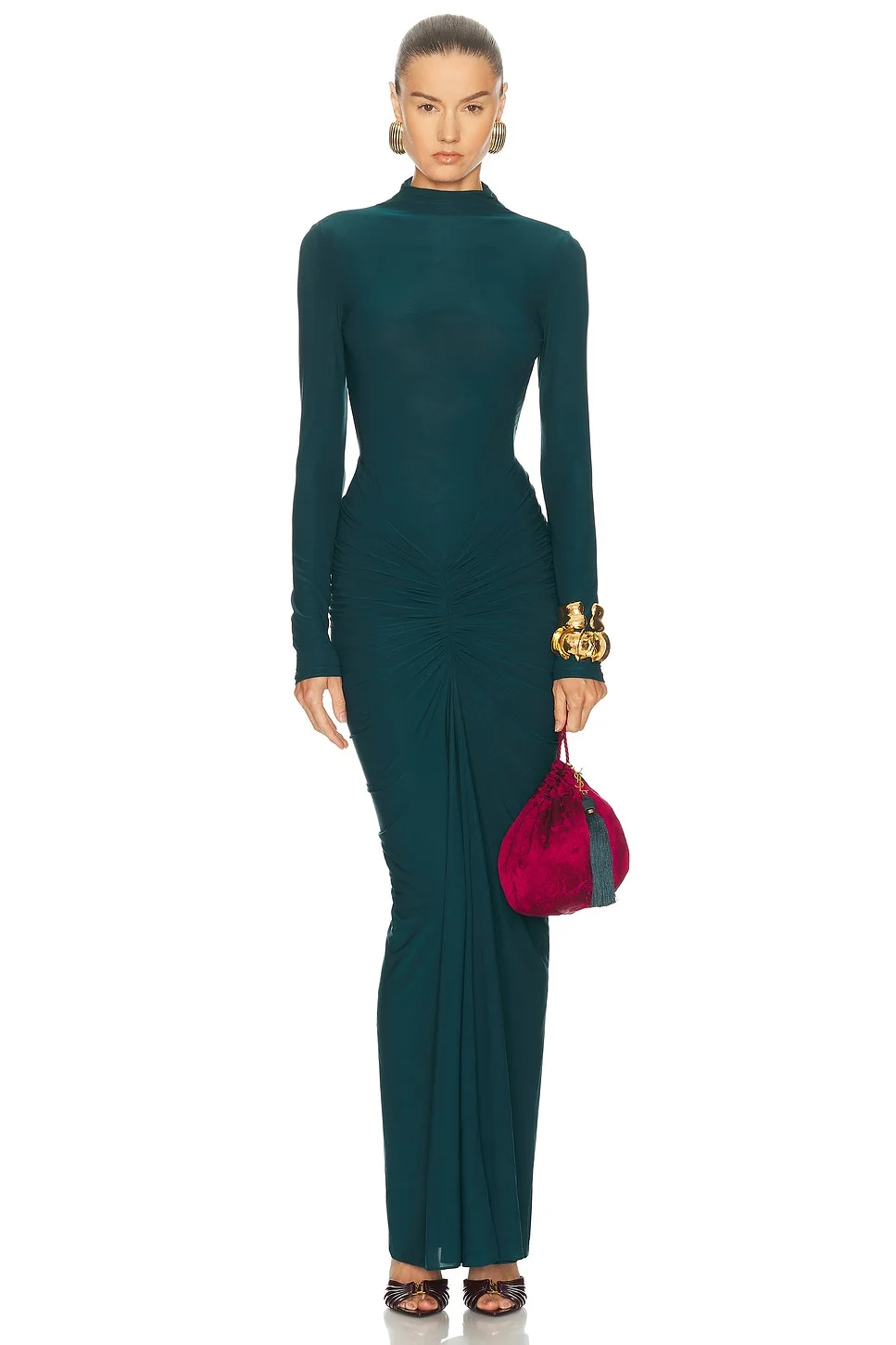 Details - 90% polyester, 10% spandex - Dry clean only - Unlined - Hidden back zipper closure - Mockneck styling - Slinky jersey fabric with ruching detail - Made in China - Our Style No. RONR-WD802 - Manufacturer Style No. 4484018TJE