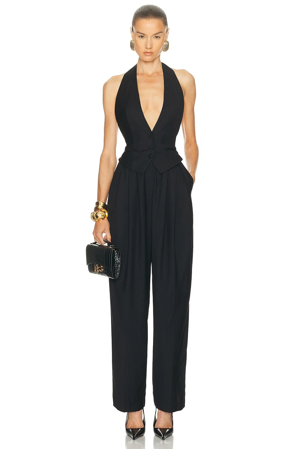 Details - Self: 65% Polyester, 35% Viscose - Lining: 55% Viscose, 45% polyester - Dry clean - Pull on styling with zip fly at pant and button closure at vest - Halterneck with button closure - Made in China - Our Style No. RONR-WC34 - Manufacturer Style No. 4419128PIN
