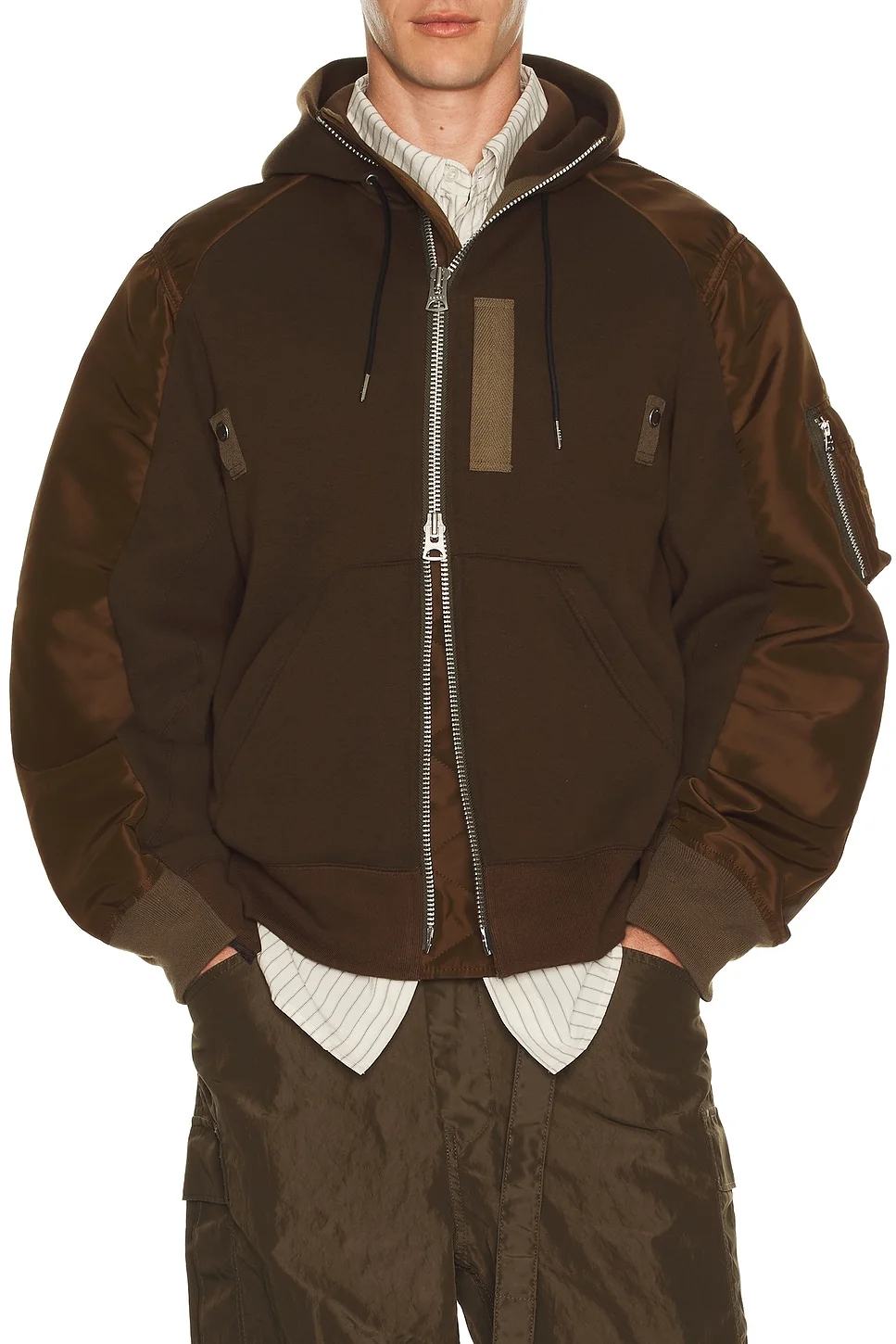 Details - Self: 62% cotton, 38% polyester - Self 2: 55% polyester, 44% cotton, 1% polyurethane - Dry clean only - Two-way front zip closure - Split kangaroo pocket with drawstring hoodie - Utility pocket on sleeve - Midweight jersey with contrast ripstop back panel - Made in Japan - Our Style No. SACF-MK49 - Manufacturer Style No. 26-03948M