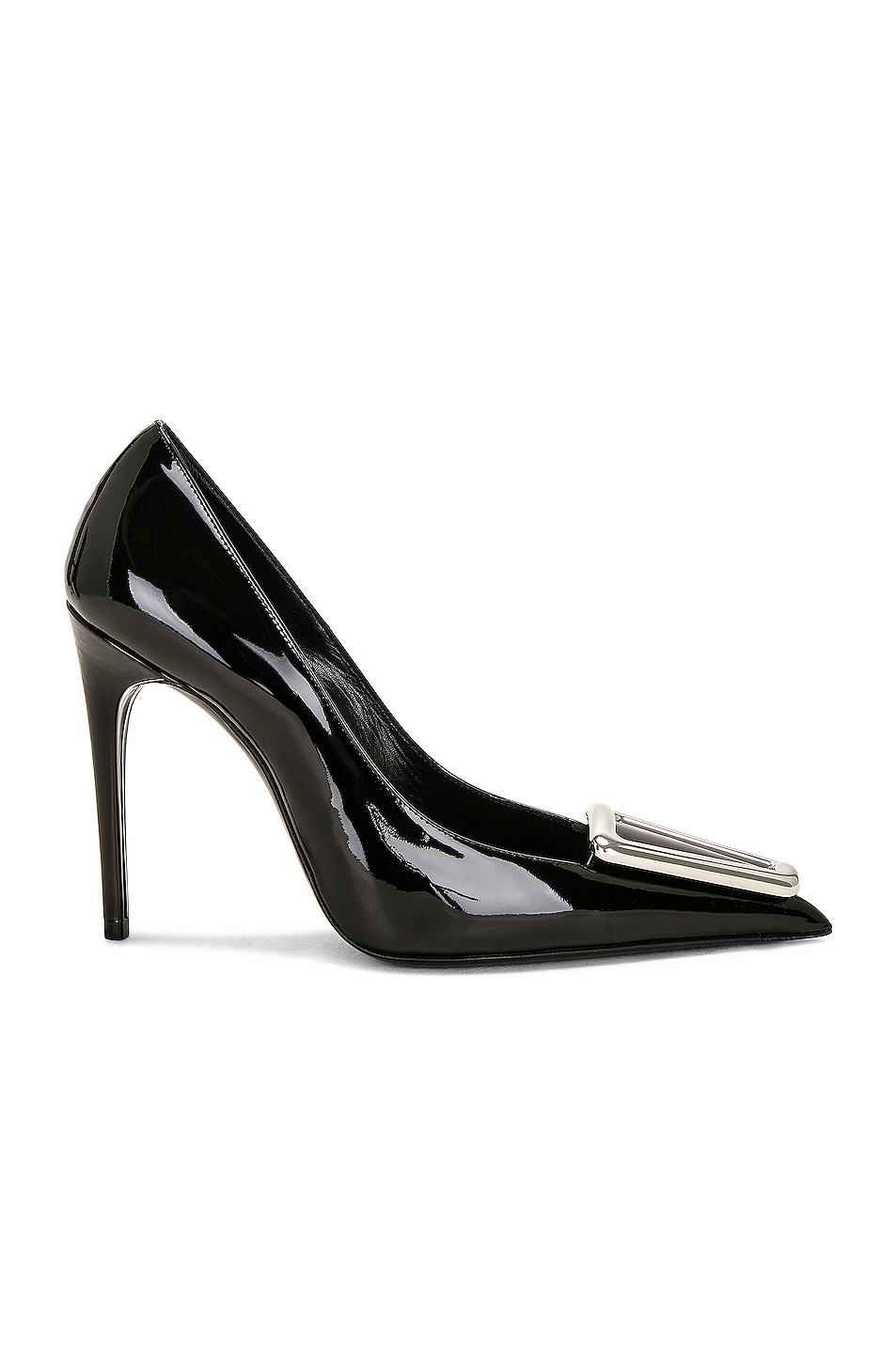 Details - Patent leather upper with leather sole - Made in Italy - Slip-on styling - Leather footbed and lining - Silver-tone triangle hardware at vamp - Pointed toe with stiletto heel - Approx 108mm/ 4.25 inch heel - This item is not available to ship to Indonesia - Our Style No. SLAU-WZ1114 - Manufacturer Style No. 756048-1TVNN-1000