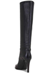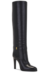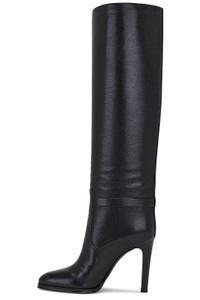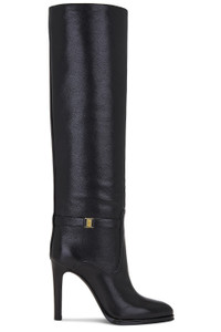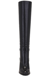Details - Suede upper with calfskin sole - Made in Italy - Pull-on styling - Calfskin lining - Cassandre guilloch metal buckle - Pointed toe with stiletto heel - Approx 98mm/ 3.9 inch heel - Approx 296mm/ 11.7 inch shaft - Shaft measures approx 41 cm in circumference - This item is not available to ship to Indonesia - Our Style No. SLAU-WZ1287 - Manufacturer Style No. 743797-25V00-1000