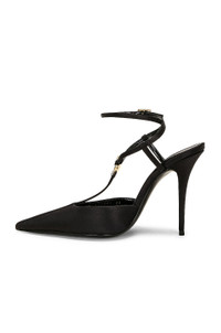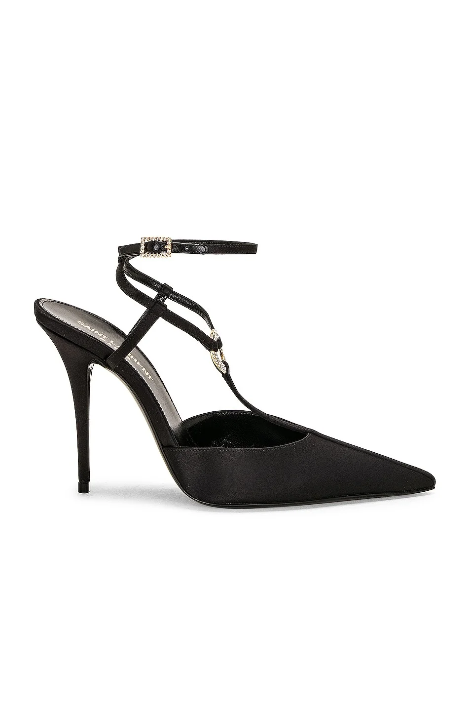 Details - Crepe satin upper with leather sole and gold-tone hardware - Made in Italy - Ankle strap with crystal embellished buckle closure - Front T-strap with crystal embellished ring detail - Leather lining - Pointed toe with satin-covered stiletto cone heel - Approx 105mm/ 4.13 inch heel - This item is not available to ship to Indonesia - Our Style No. SLAU-WZ1028 - Manufacturer Style No. 733442-1UUKK-1000
