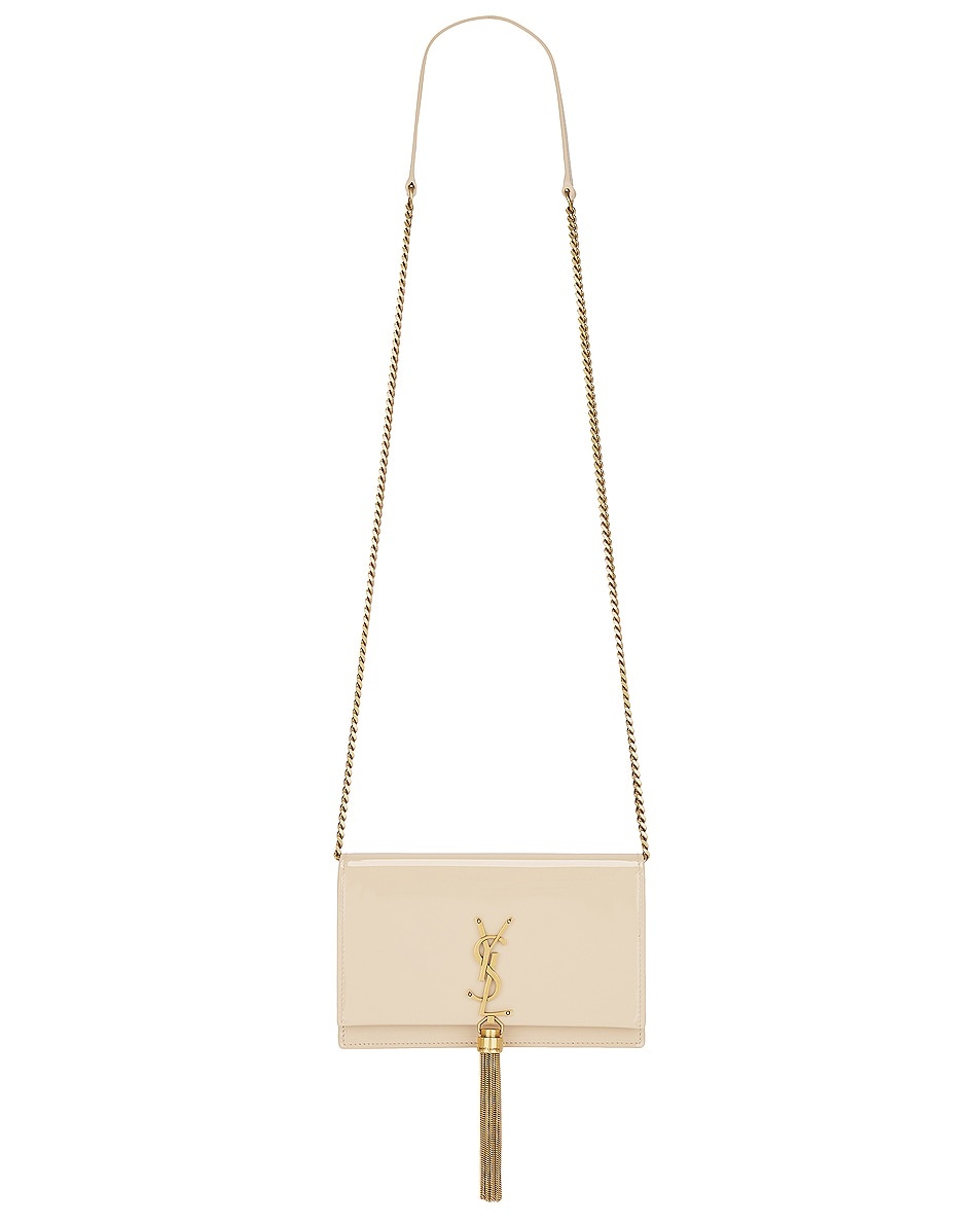 Details - Patent leather exterior with smooth leather lining - Made in Italy - Flap top with magnetic button closure - One main compartment - One interior slip pocket, six interior card slots and one interior zip pocket - Bronze tassel detail - Measures approx 7.5" W x 4.5" H x 1.5" D - Detachable shoulder strap with a 21.5" drop - This item is not available to ship to Indonesia - Our Style No. SLAU-WY2547 - Manufacturer Style No. 742833-BMIIW-9906