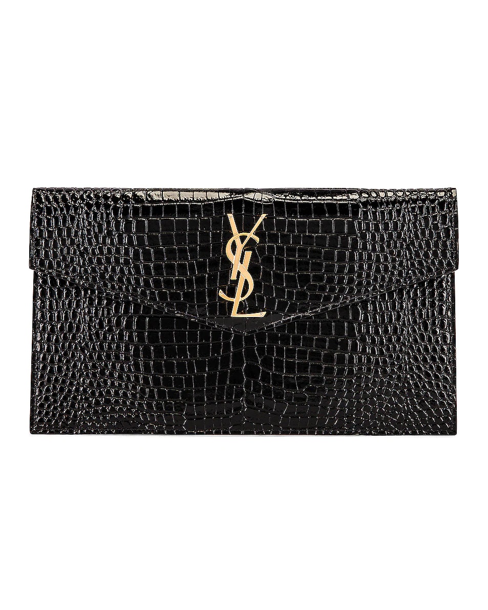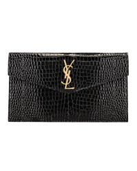 Details - Shiny croc embossed calfskin leather with grosgrain lining and polished gold-tone hardware - Made in Italy - Envelope flap top with hidden magnetic closure - One main compartment - Interior gold foil logo patch - Metal YSL monogram on front - Measures approx 10.5"W x 6.25"H x 0.15"D - This item is not available to ship to Indonesia - Our Style No. SLAU-WY1464 - Manufacturer Style No. 565739-DND0J-1000