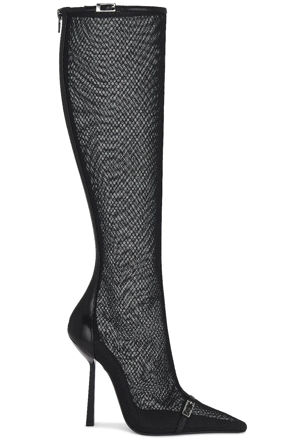 Details - Mesh upper and leather sole - Made in Italy - Back zipper closure - Silver-tone buckle detail at top and thigh - Square toe - Rubber tap heel - Approx 115mm/ 4.5 inch heel - Approx 393mm/ 15.5 inch shaft - Shaft measures approx 11" in circumference - This item is not available to ship to Indonesia - Our Style No. SLAU-WZ1168 - Manufacturer Style No. 763458-AACTB-1000