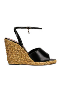 Details - Sheepskin upper and sole with aged gold-tone hardware - Braided raffia midsole - Made in Italy - Ankle strap with buckle closure and interlaced YSL charm - Leather lining with Saint Laurent logo print - Approx 108mm/ 4.25 inch wedge - This item is not available to ship to Indonesia. This item is not available to ship to Australia - Our Style No. SLAU-WZ859 - Manufacturer Style No. 688689-1ZJ00-1000