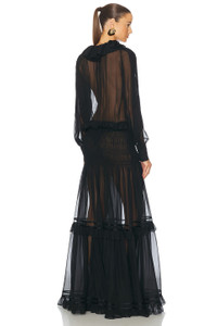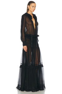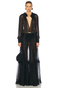Details - 100% silk - Made in France - Dry clean only - Unlined - Partial front button closure - Plunging V-neckline - Sheer chiffon fabric with tiered ruffle skirt - Garment is intentionally sheer, undergarments will show through. - Please note undergarment not included - This item is not available to ship to Indonesia - Our Style No. SLAU-WD301 - Manufacturer Style No. 814447-Y115W-1000