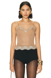 Details - Self: 100% viscose - Details: 88% polyamide, 12% elastane - Made in Italy - Dry clean only - Lightweight mesh fabric with delicate lace trim - Garment is intentionally sheer, undergarments will show through - This item is not available to ship to Indonesia - Our Style No. SLAU-WS322 - Manufacturer Style No. 716711-Y096Q-2841