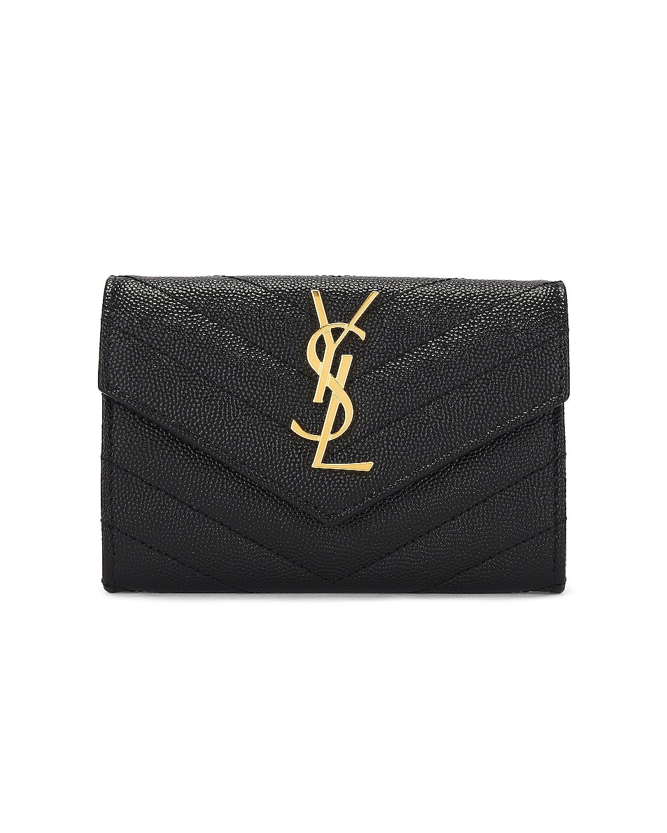 Details - Pebbled leather exterior and lining - Made in Italy - Fold-over flap top with snap button closure - One main compartment - Four interior card slots - Back flat pocket - Aged bronze-tone metal YSL cassandre on front - Measures approx 5"W x 3.5"H x 1"D - This item is not available to ship to Indonesia - Our Style No. SLAU-WY2631 - Manufacturer Style No. 414404-BOW01-1000