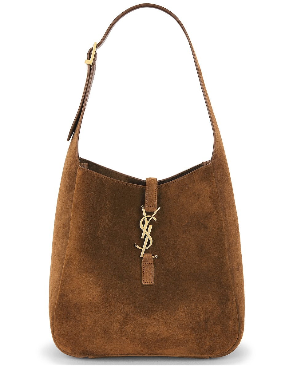 Details - Suede exterior with calfskin leather trim and gold-tone hardware - YSL hook closure - One main compartment - One interior zipper pocket - Front gold-tone cassandre hardware - Adjustable shoulder strap - Measures approx 17 cm W x 16 cm H x 7 cm D - Shoulder strap with a 26 cm drop - This item is not available to ship to Indonesia - Made in Italy - Our Style No. SLAU-WY3150 - Manufacturer Style No. 713938-1U80W-2916