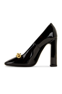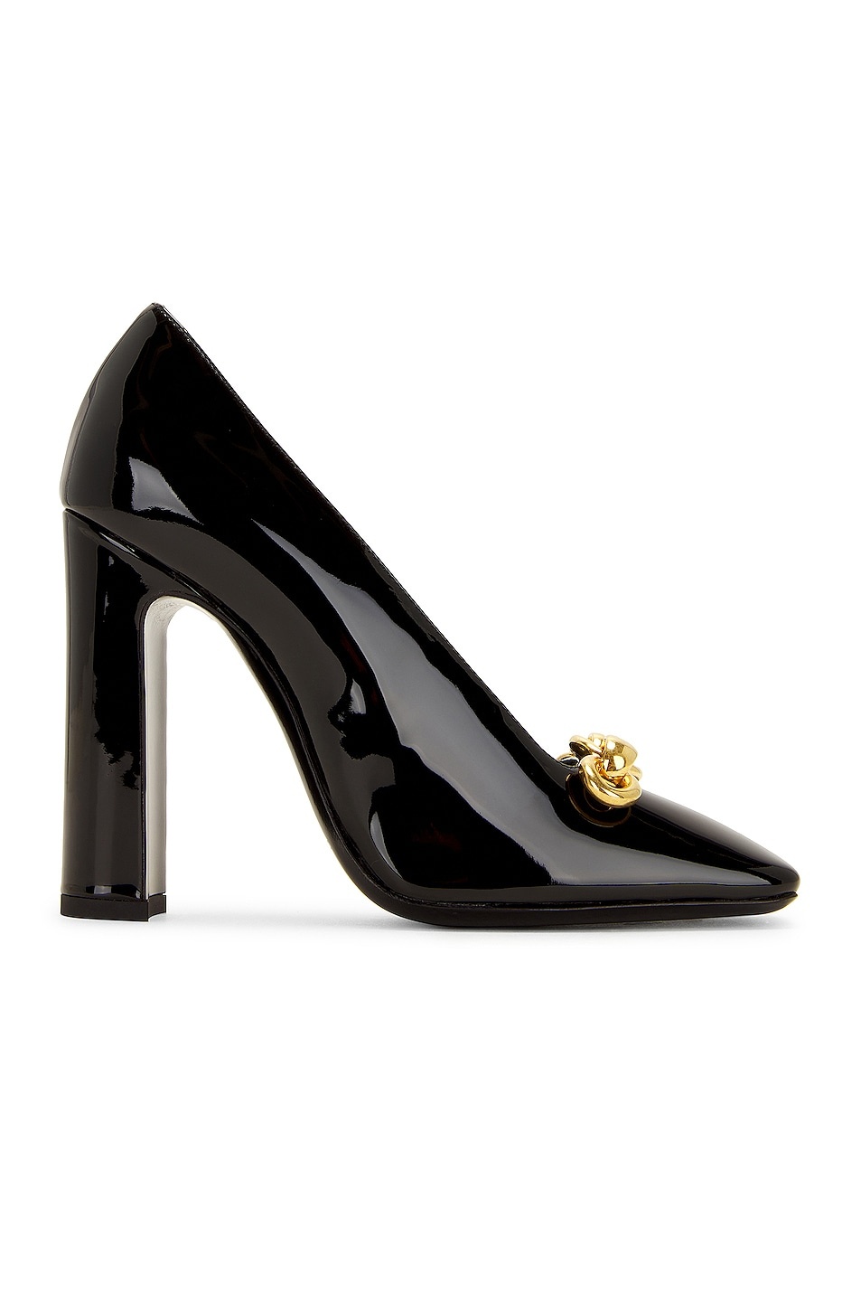 Details - Patent calfskin upper with leather sole and bronze-tone hardware - Made in Italy - Chainlink accent at vamp - Leather lining - Square toe with patent leather-covered block heel - Approx 110mm/ 4.3 inch heel - This item is not available to ship to Indonesia - Our Style No. SLAU-WZ997 - Manufacturer Style No. 7139241TVKK
