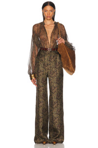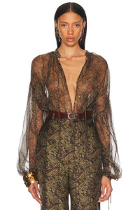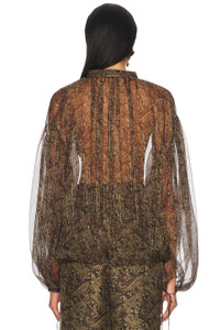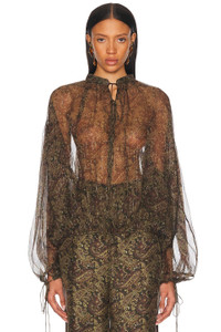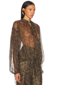 Details - 96% silk 4& metallized fibers - Dry clean only - Front tie closure - Adjustable tie hem - Allover metallic detailing - Lightweight satin fabric - Item not sold as a set - Garment is intentionally sheer, undergarments will show through. - This item is not available to ship to Indonesia - Made in Italy - Our Style No. SLAU-WS453 - Manufacturer Style No. 830837-Y7K01-1355