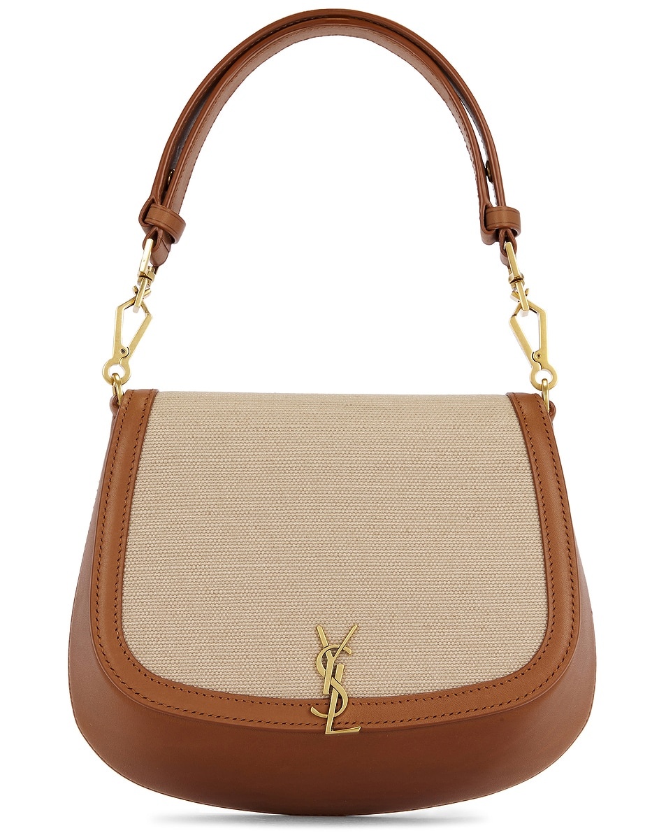 Details - Canvas exterior with leather trim and suede lining - Flaptop with magnetic button closure - One main compartment - Interior flat pocket - Measures approx 18 cm W x 21 cm H x 8 cm D - Shoulder strap with a 14 cm-24 cm drop - This item is not available to ship to Indonesia - Made in Italy - Our Style No. SLAU-WY3109 - Manufacturer Style No. 818896-FAAVH-9856