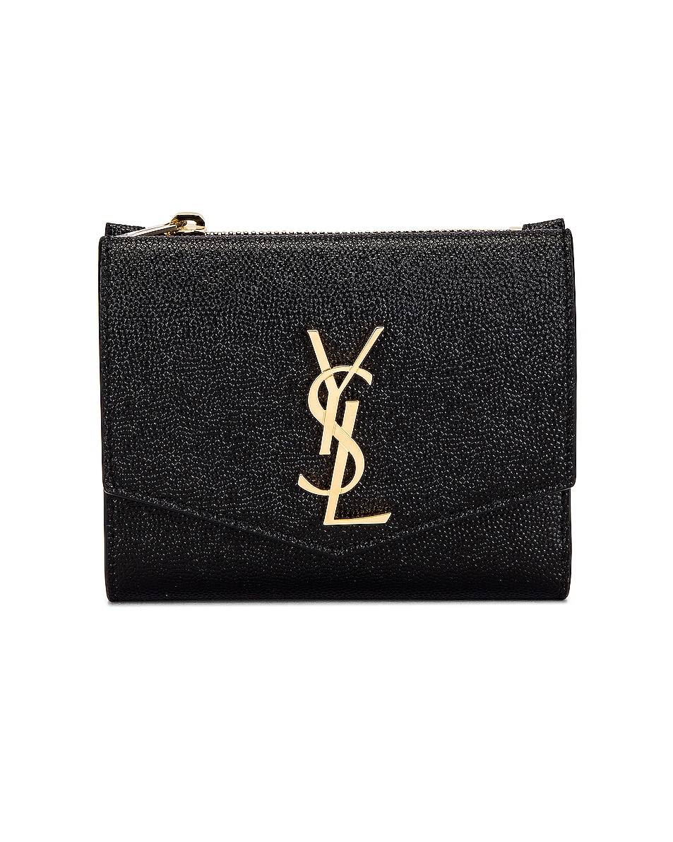 Details - Grain de poudre calfskin with gold-tone hardware - Made in Italy - Tri-fold closure with snap button closure - Six card slots and four slip compartments - One bill compartment - Zip coin compartment and gusseted flat pocket - Metal YSL initials on front - Measures approx 4.5"W x 4"H x 1"D - This item is not available to ship to Indonesia - Our Style No. SLAU-WY1755 - Manufacturer Style No. 582296-1GF0J-1000