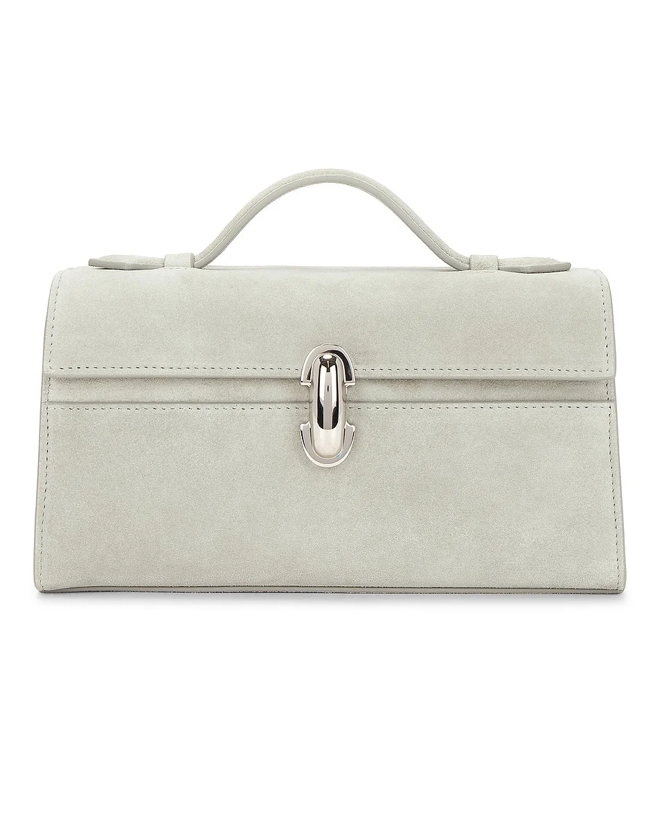 Details - Suede exterior with silver-tone hardware and suede lining - Turnlock closure - One main compartment - One interior slip pocket - Measures approx 23 cm W x 13 cm H x 8 cm D - Top handle with a 3 cm drop - Made in Italy - Our Style No. SVEX-WY51 - Manufacturer Style No. H-005-03-1-03