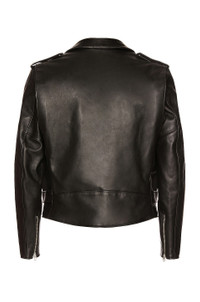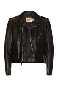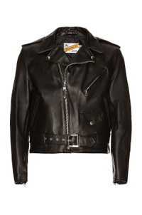 Details - Self: 100% cowhide leather - Body Lining: 100% cotton - Sleeve Lining: 100% poly - Made in USA - Professional leather cleaning only - Asymmetrical front zip closure - Snap-down lapels - Attached half belt with nickel plated square buckle - Shoulder epaulettes with star accents and zipper closure at cuffs - Front zipper pockets - Interior welt pocket - Our Style No. SCHF-MO2 - Manufacturer Style No. 613
