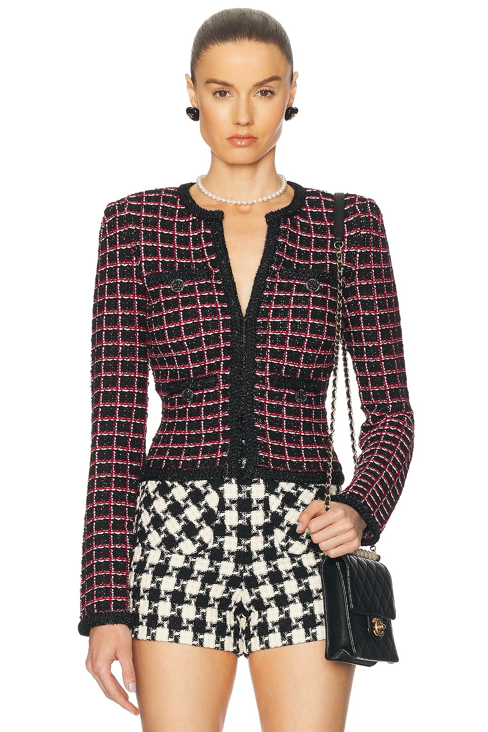 Details - 49% viscose, 18% cotton, 15% polyester, 13% polyamide, 4% wool, 1% metallised fiber - Made in China - Dry clean - Front hook and eye closure - 4-pocket styling - Detachable shoulder pads - Tweed fabric with metallic threading throughout - Our Style No. SPOF-WK27 - Manufacturer Style No. SS25-009C-B