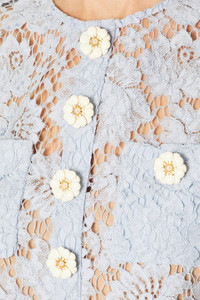 Details - Self 1: 63% polyamide, 27% cotton, 10% viscose - Self 2: 100% polyester - Made in China - Dry clean only - Optional nude slip lining - Hidden back zipper closure - Front faux floral button accent - Lace fabric - Our Style No. SPOF-WD462 - Manufacturer Style No. SS25-044S-BL