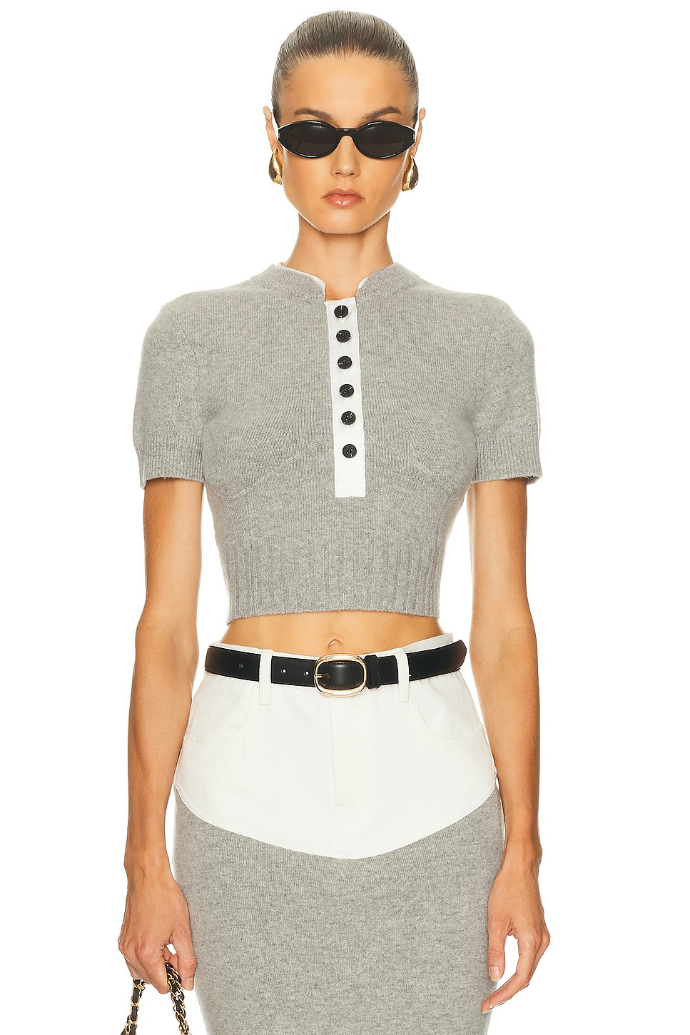 Details - Self 1: 69% wool, 26% cashmere, 4% polyamide, 1% elastane - Self 2: 97% polyester, 3% elastane - Dry clean only - Front partial button closure - Cropped fit - Midweight knit fabric - Item not sold as a set - Made in China - Our Style No. SPOF-WS152 - Manufacturer Style No. AW25-003T-GR