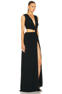 Details - 96% viscose, 4% elastane - Made in Canada - Dry clean only - Unlined - Pull-on styling - Bodice cut-out - Knotted detail at front - Jersey fabric with side seam slit - Our Style No. SGUF-WD2 - Manufacturer Style No. D.SS2233B