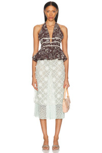 Details - 100% polyester - Hand wash - Halterneck tie-up closure - Back tie-up closure - Plunging front neckline - Open back - Lightweight crepe fabric with embroidered detail - Made in Turkey - Our Style No. SEDF-WS63 - Manufacturer Style No. WSS25TP15