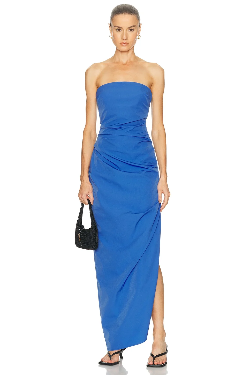 Details - Self: 90% nylon, 10% spandex - Lining: 65% cotton, 32% nylon, 3% elastane - Made in China - Dry clean only - Fully lined - Hidden side zipper closure - Midweight poplin - Ruched bodice - Our Style No. SIF-WD213 - Manufacturer Style No. SIR425-1059