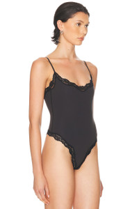 Details - Self 1: 76% polyamide, 24% elastane - Self 2: 66% polyamide, 24% polyester, 10% elastane - Machine wash - Gusset button snap closure - Adjustable shoulder straps - Thong design - Jersey fabric with lace trim - Made in Vietnam - Our Style No. SKMF-WS10 - Manufacturer Style No. BD-THG-9112