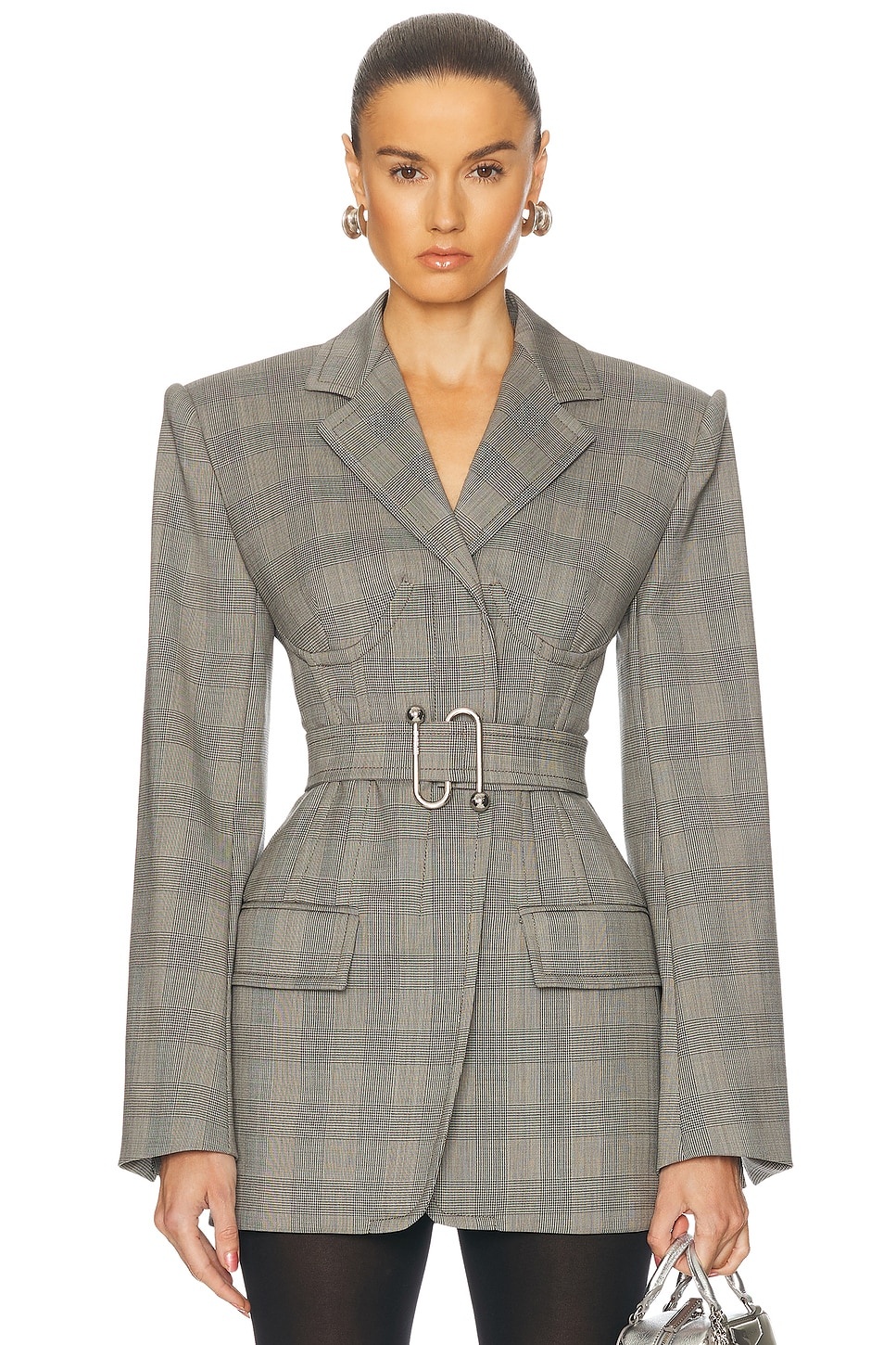 Details - Self: 97% wool, 2% polyamide, 1% elastane - Lining: 70% acetate, 30% polyester - Made in Poland - Dry clean only - Front button closure with detachable waist belt and statement silver-tone metal buckle - Dual flap pockets - Suiting fabric with notched lapels, padded shoulders, and notched cuffs - Our Style No. STMF-WO3 - Manufacturer Style No. 2512041051600