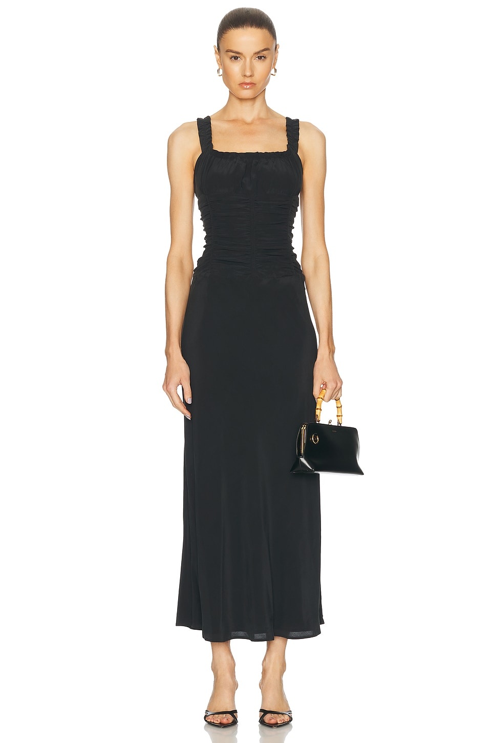 Details - Self: 100% silk - Lining: 100% polyester - Made in China - Dry clean only - Fully lined - Hidden back zipper closure - Elastic stretch at shoulder straps - Boned at bodice - Crepe fabric with ruching detail - Our Style No. STAD-WD283 - Manufacturer Style No. R25S2254SD