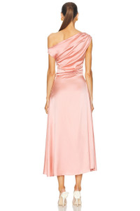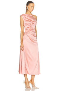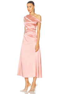 Details - 93% silk, 7% elastane - Made in China - Dry clean only - Unlined - Hidden side zipper closure - Off-shoulder styling - Satin fabric with ruching detail at bodice - Our Style No. STAD-WD282 - Manufacturer Style No. R25S2316SN