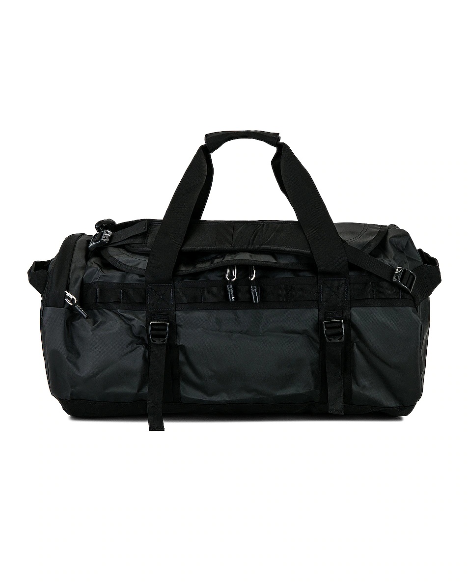 Details - 1000D phthalate-free, recycled PVC with non-PFC (Non-PFC DWR) finish - Made in Cambodia - D-zip opening with a weather-resistant, zippered flap - One main compartment with a secure-zip mesh pocket and an end-cap mesh sleeve pocket for more organization - Two padded side handles serve as both duffel carry handles and haul handles - Detachable, adjustable, alpine-cut shoulder straps for an ergonomic fit with minimal twisting - Legendary rugged construction offers water-resistant Base Camp material, extra bartacks, and double stitching - Printed North Face logo at side - Measures approx 25"W x 14"H x 14"D - Our Style No. TACF-MY15 - Manufacturer Style No. NF0A52SA