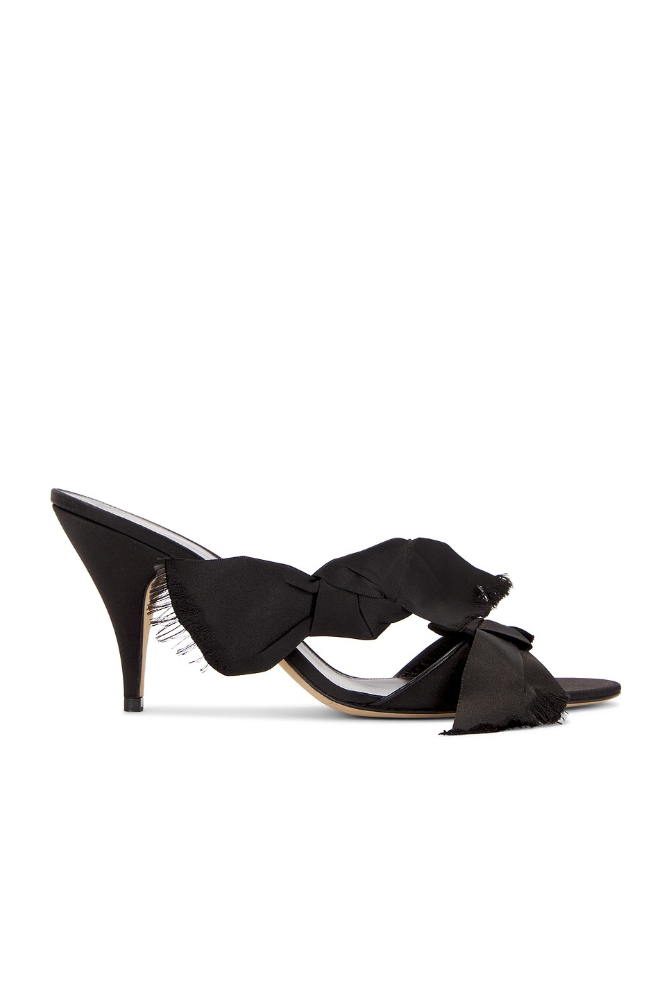 Details - Satin upper with calf leather sole - Made in Italy - Slip-on styling - lamb leather footbed and lining - Dual straps with fringed knot detail - Open almond toe - Approx 90mm/ 3.5 inch heel - Our Style No. TERX-WZ384 - Manufacturer Style No. F1569-W326