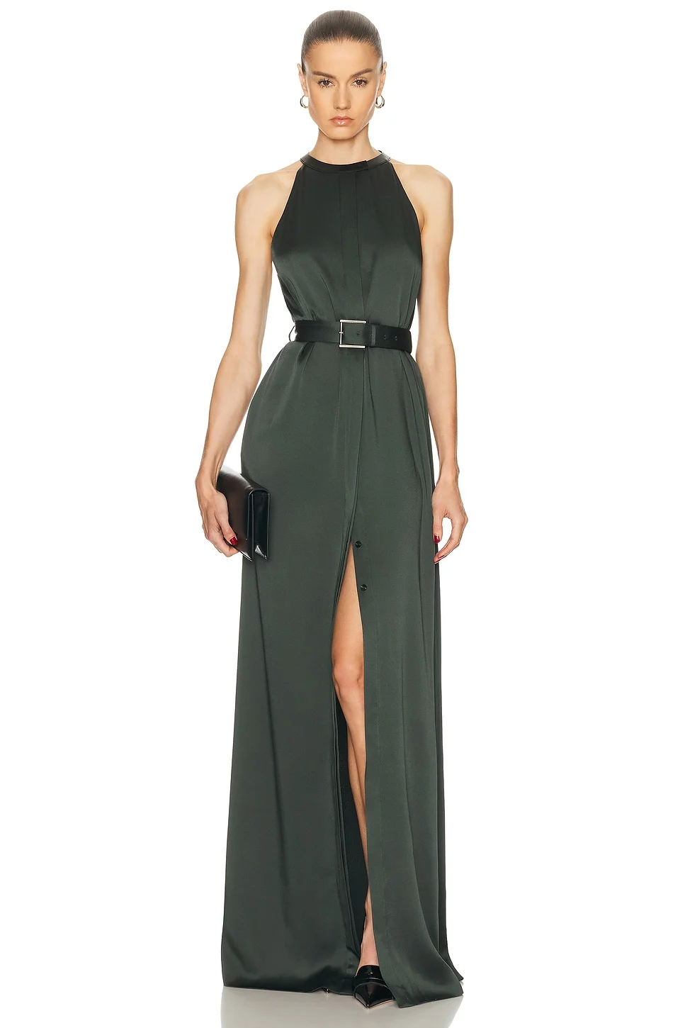 Details - Self 1: 73% acetate, 27% viscose - Self 2: 100% lamb leather - Made in Italy - Spot clean only - Unlined - Front covered button-down closures with detachable waist belt - Snap button closure at collar - Midweight satin textile with leather trims - Front slit styling - Our Style No. TFOF-WD159 - Manufacturer Style No. AB3629-FAX1524