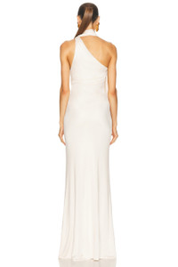 One-shoulder paneled ruched satin-jersey halterneck gown Off-white