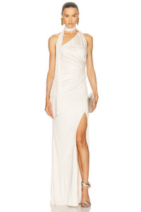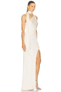 Details - 100% viscose - Dry clean only - Fully lined - Halterneck hook and eye clasp closure - Hidden side zipper closure - Wraparound scarf design - Slinky high-shine jersey fabric with front slit - Made in Italy - Our Style No. TFOF-WD144 - Manufacturer Style No. ABJ864-JEX169