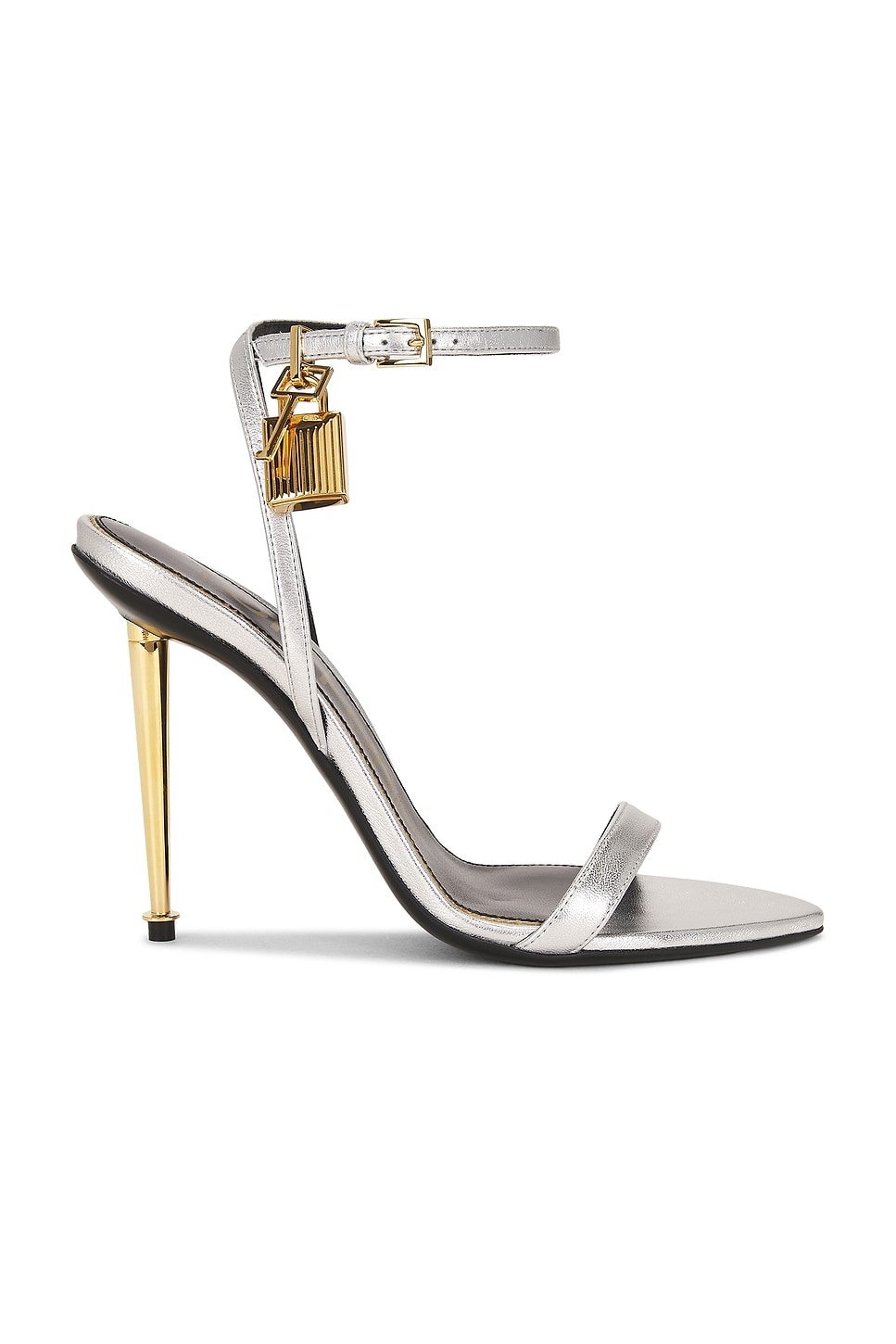 Details - Metallic leather upper with leather sole - Ankle strap with buckle closure - Leather lining - Signature gold-tone padlock metal hardware - Pointed toe - Rubber tap heel - Please note this style runs narrow in the forefoot, consider sizing a half to full size up - Approx 105mm/ 4.15 inch iconic metal spike heel - Made in Italy - Our Style No. TFOF-WZ123 - Manufacturer Style No. W2272-LSP014G
