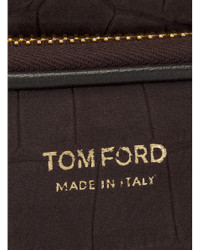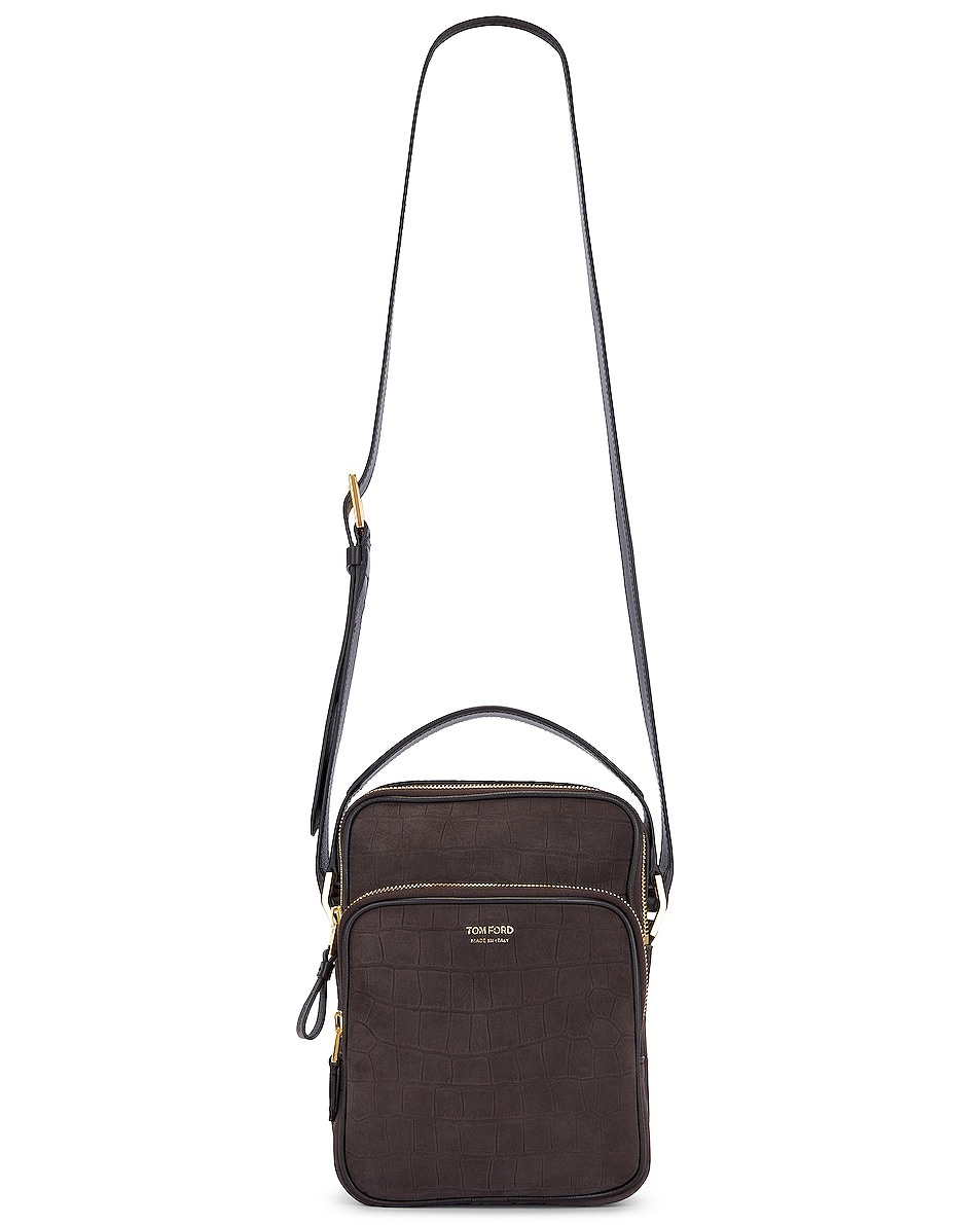 Details - Smooth croc embossed exterior with cotton twill lining - Made in Italy - Top zipper closure - One main compartment - Interior slip pocket - Front zippered compartment with leather pull - Embossed silver-tone Tom Ford logo at front - Adjustable leather shoulder strap - Measures approx 6.25" W x 8.5" H x 2" D - Shoulder strap with a 20" drop - Our Style No. TFOF-MY41 - Manufacturer Style No. H0465-LCL379G