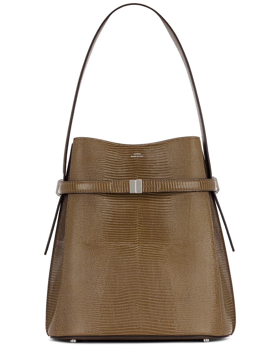 Details - Lizard embossed patent leather exterior with suede lining - Top lobster clasp closure - One main compartment - Dual interior slip pockets - Belted design with silver-tone metal hardware - Integrated shoulder strap - Measures approx 10.5" W x 11.5" H x 6" D - Shoulder strap with a 9" drop - Made in Italy - Our Style No. TOTF-WY26 - Manufacturer Style No. 251-WAL0048-LE0102