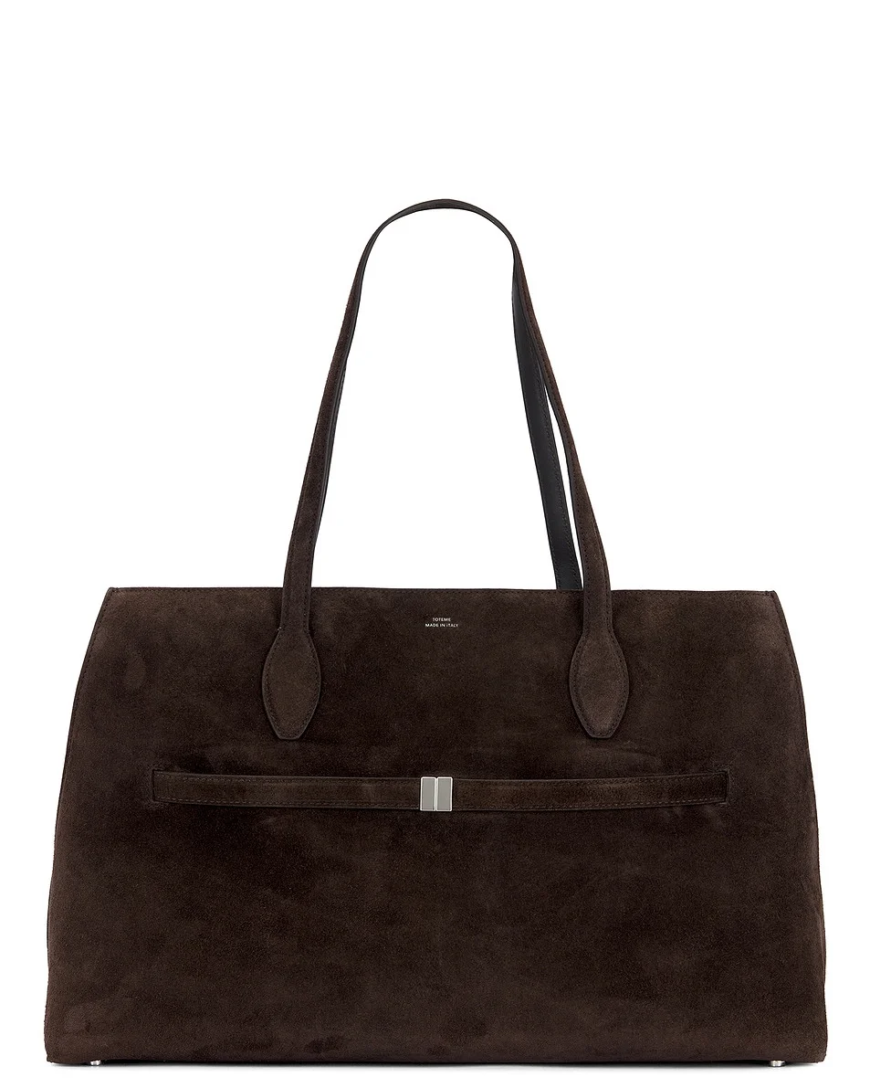 Details - Suede leather with microsuede lining - Lobster clasp closure - One main compartment - Silver-tone hardware - Exterior functional belt design - Measures approx 44 cm W x 28 cm H x 14 cm D - Top handles with a 61 cm drop - Made in Italy - Our Style No. TOTF-WY40 - Manufacturer Style No. 253-WAL0073-LE0004